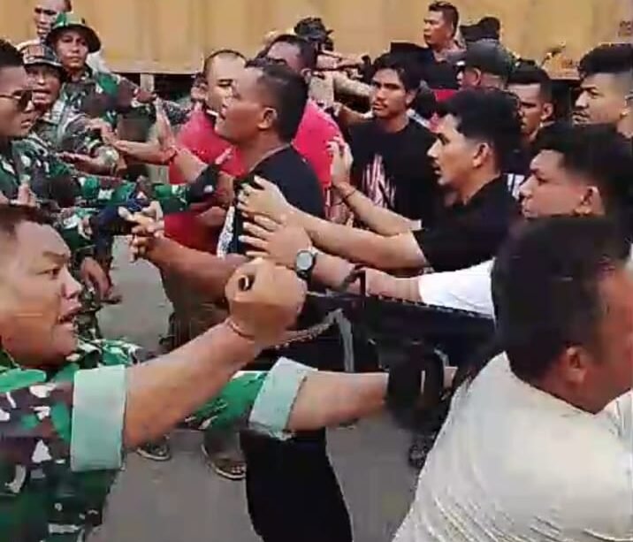 Seorang anggota TNI nampak sedang menghujamkan popor senjata api ke arah peserta aksi demonstrasi di halaman Kantor Bupati Aceh Utara pada (25/12). Foto: Istimewa