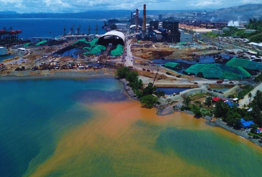 Kawasan Industri Nikel PT Indonesia Weda Bay Industrial Park (IWIP) di Halmahera Tengah. Foto ini juga menunjukkan menunjukkan perairan pesisir di sekitar kawasan industri yang tampak keruh. Foto: Rifki Anwar untuk JATAM Malut.