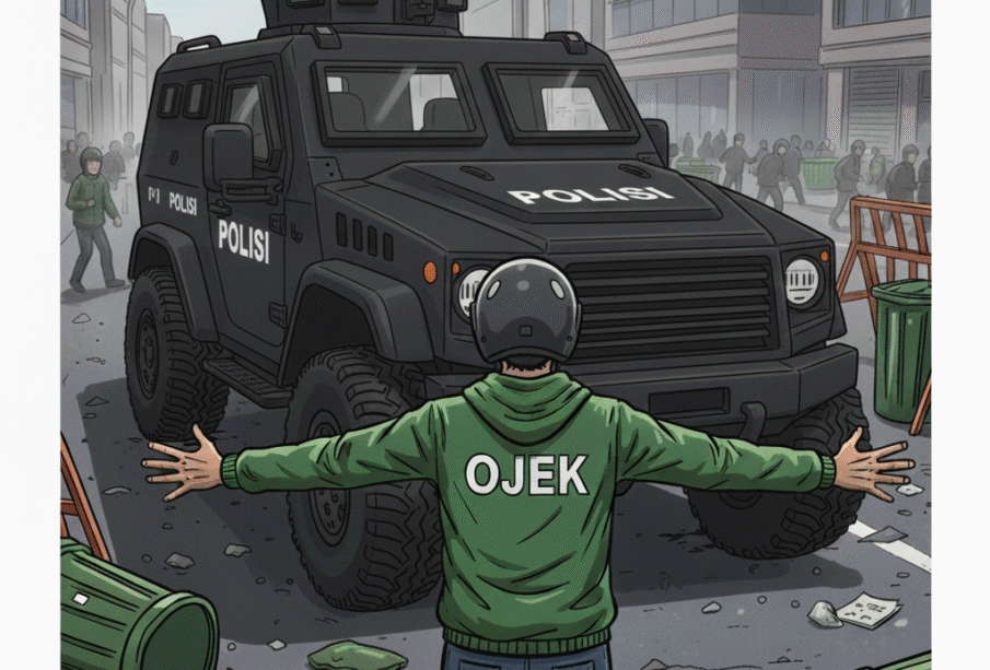 Ilustrasi seorang driver ojek online berhadapan dengan mobil rantis aparat kepolisian.