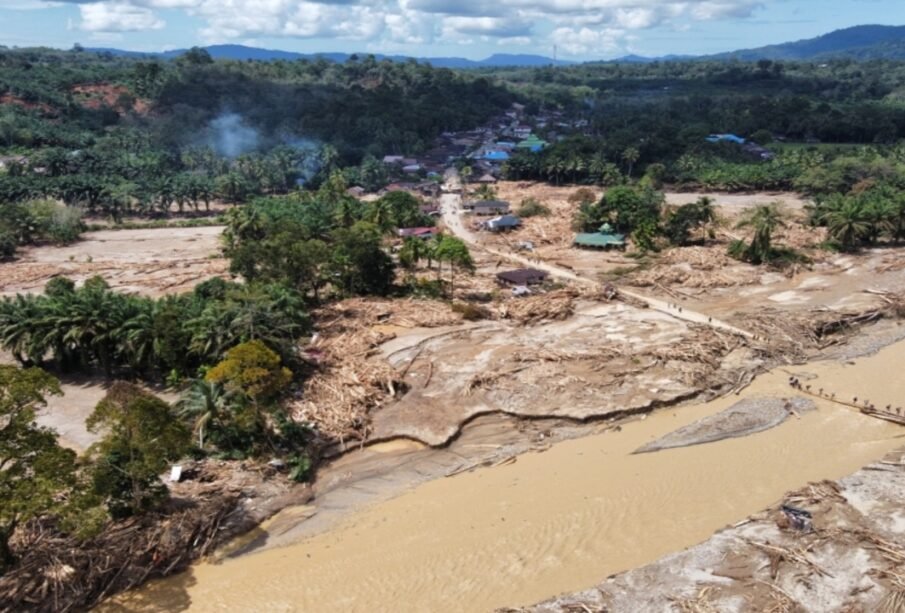 Tampak dari ketinggian sebuah desa yang terdampak banjir bandang di Batang Toru, Kabupaten Tapanuli Selatan, Sumatera Utara, pada 1 Desember 2025. Foto: AP Photo/Binsar Bakkara.