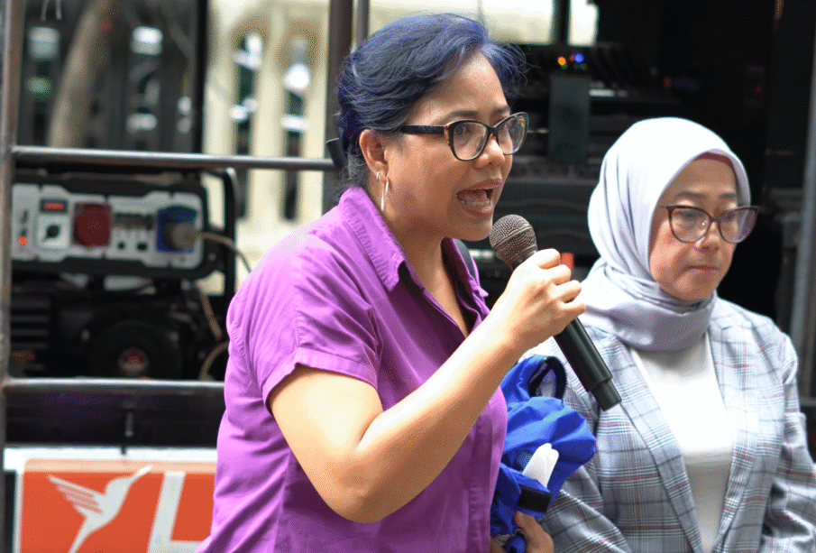 Bivitri Susanti saat berorasi di depan Pengadilan Negeri (PN) Jakarta Pusat, Kamis (8/1/2026). Foto: Mirza Bagaskara/Pedeo Project