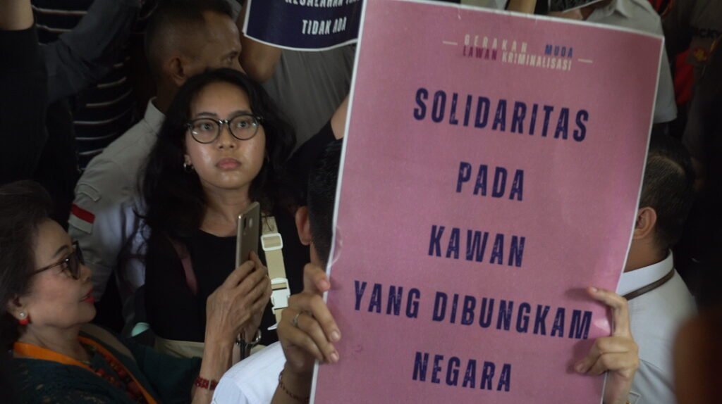 Sejumlah pengunjung sidang membawa poster saat pembacaan putusan Praperadilan Depledro dkk di PN Jakarta Selatan, Senin (27/10/2025). Foto: Mirza Bagaskara/Pedeo Project