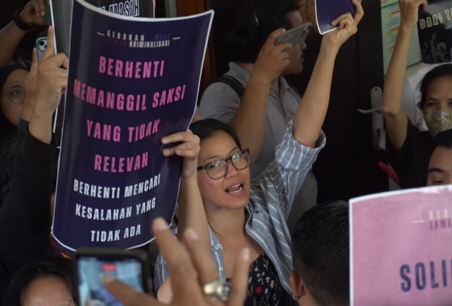 Pengunjung sidang membentangkan poster di Pengadilan Negeri (PN) Jakarta Selatan, Senin (27/10/2025). Foto: Mirza Bagaskara/Pedeo Project