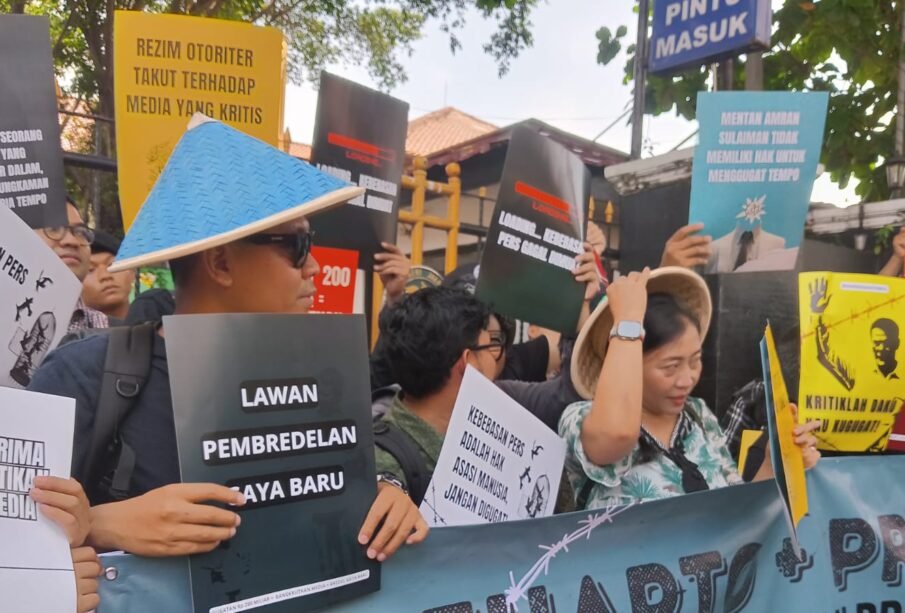Sejumlah massa aksi solidaritas atas kasus gugatan Menteri Pertanian terhadap Tempo membentangkan poster berisi kritik atas rezim pemerintahan yang otoriter pada (3/11/2025). Foto: Reza/Pedeo Project