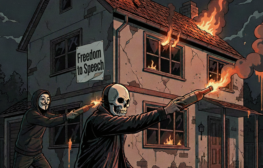 Ilustrasi dua orang bertopeng melempar molotov ke rumah bertuliskan "Freedom to Speech".