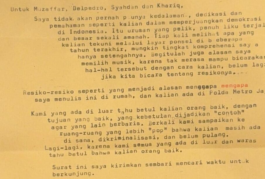 Surat Baskara HINDIA untuk Delpedro Dkk: “Kami yang ada di luar tahu betul kalian orang baik”