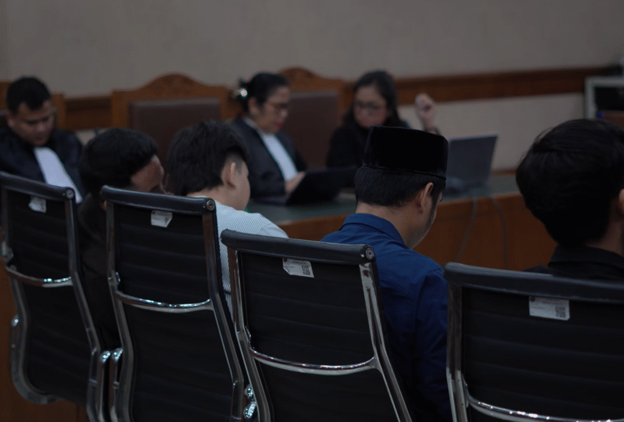 Keempat terdakwa kasus dugaan penghasutan demonstrasi Agustus 2025 saat mengikuti persidangan di PN Jakarta Pusat, Kamis (8/1/2026). Foto: Mirza/Pedeo Project