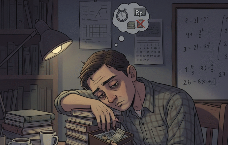 Ilustrasi seorang dosen yang nampak murung akibat kelelahan mengajarnya tak sebanding dengan upah yang ia terima.